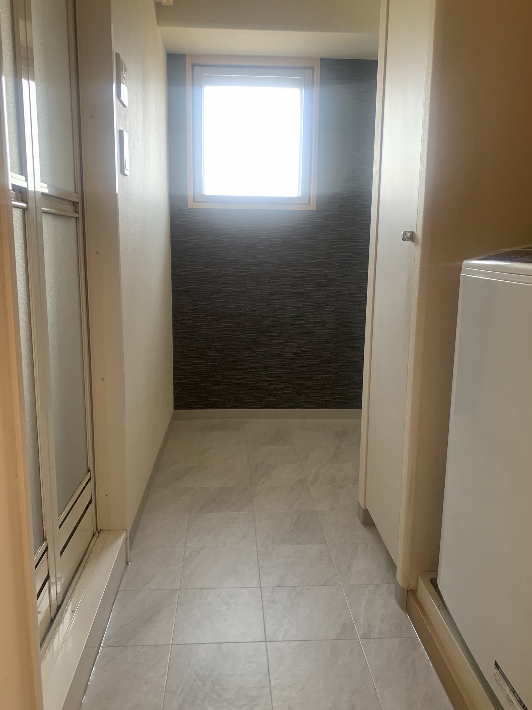 コンパクトな空間のため、廊下から入った正面の壁にアクセントクロスを取り入れるご提案をいたしました。視線が集まる場所に変化をつけることで、洗面室全体の雰囲気がぐっと引き締まりました。ご来客のご予定が近かったため、お打ち合わせから施工までをできる限りスムーズに進め、1週間以内でお引き渡しさせていただきました。